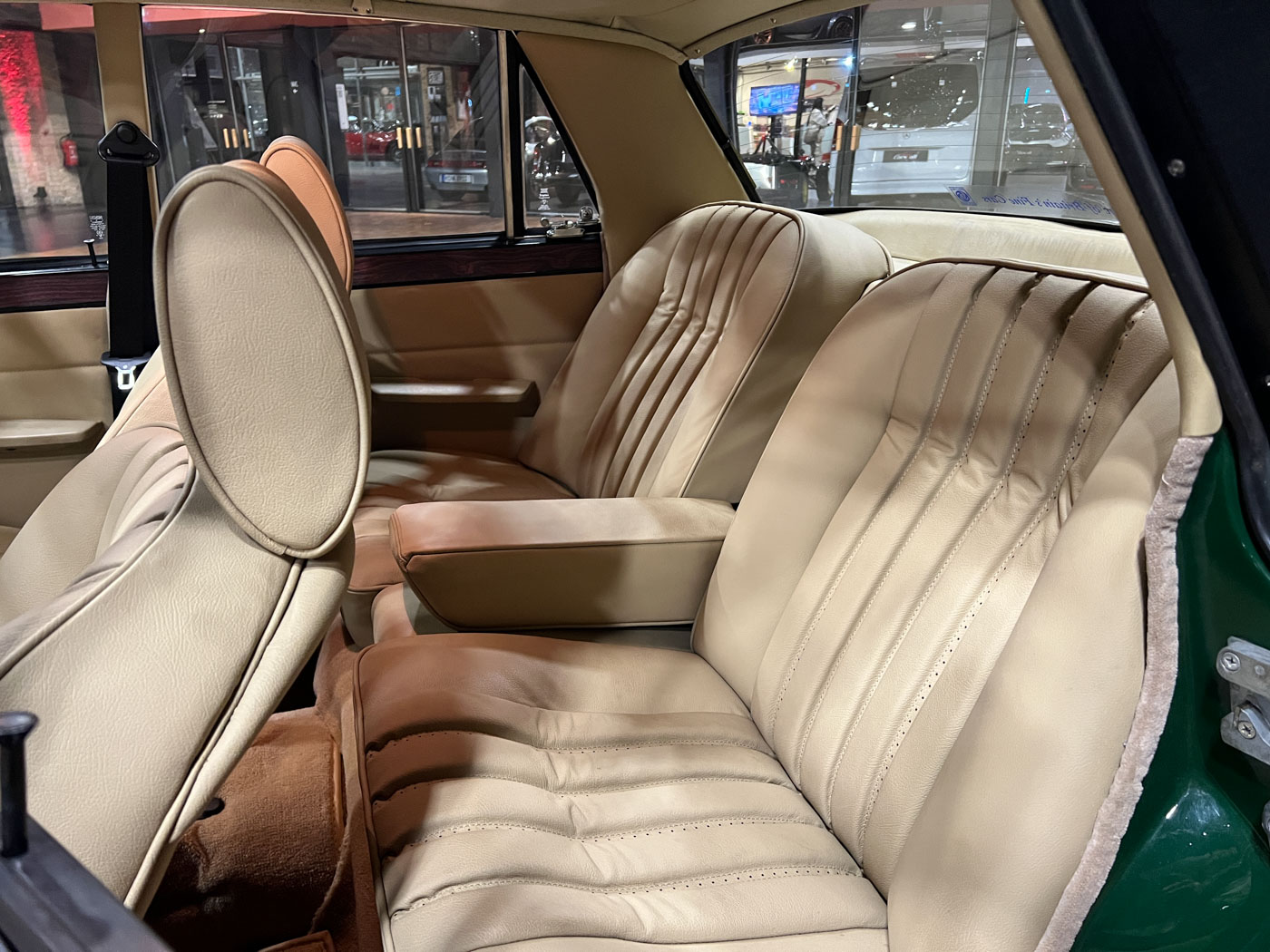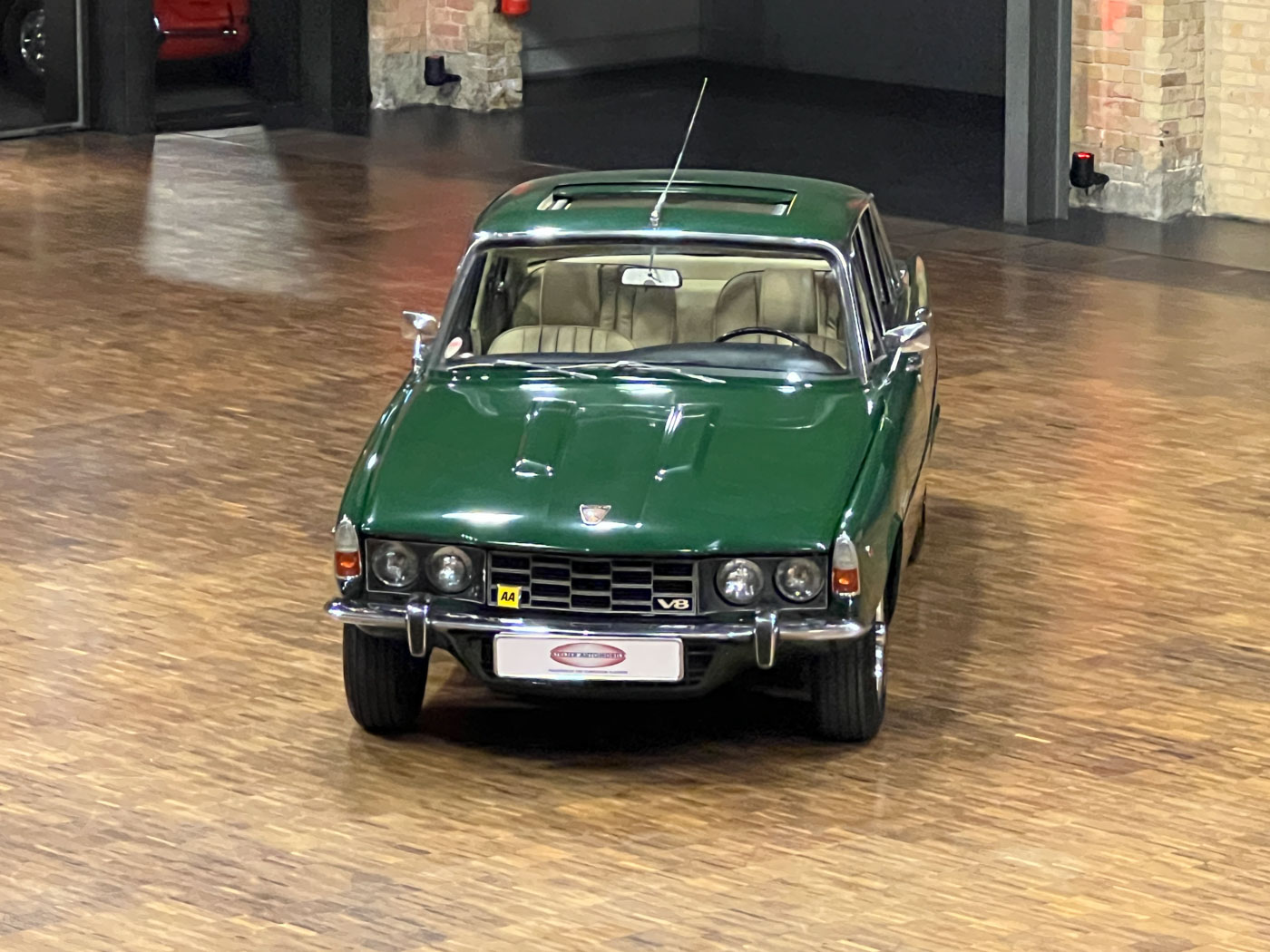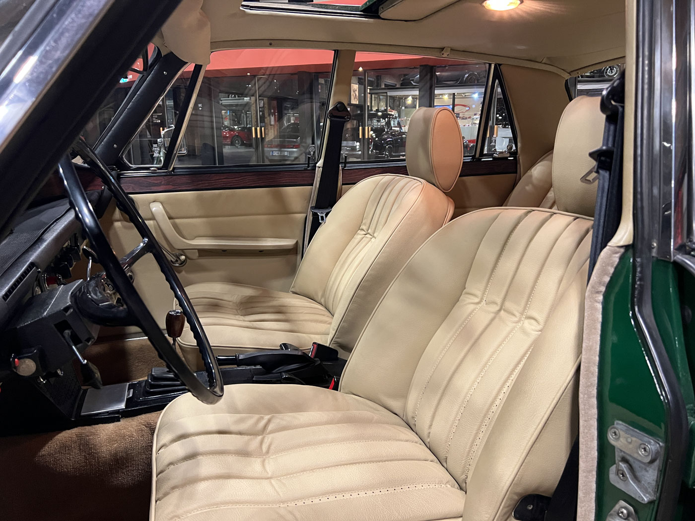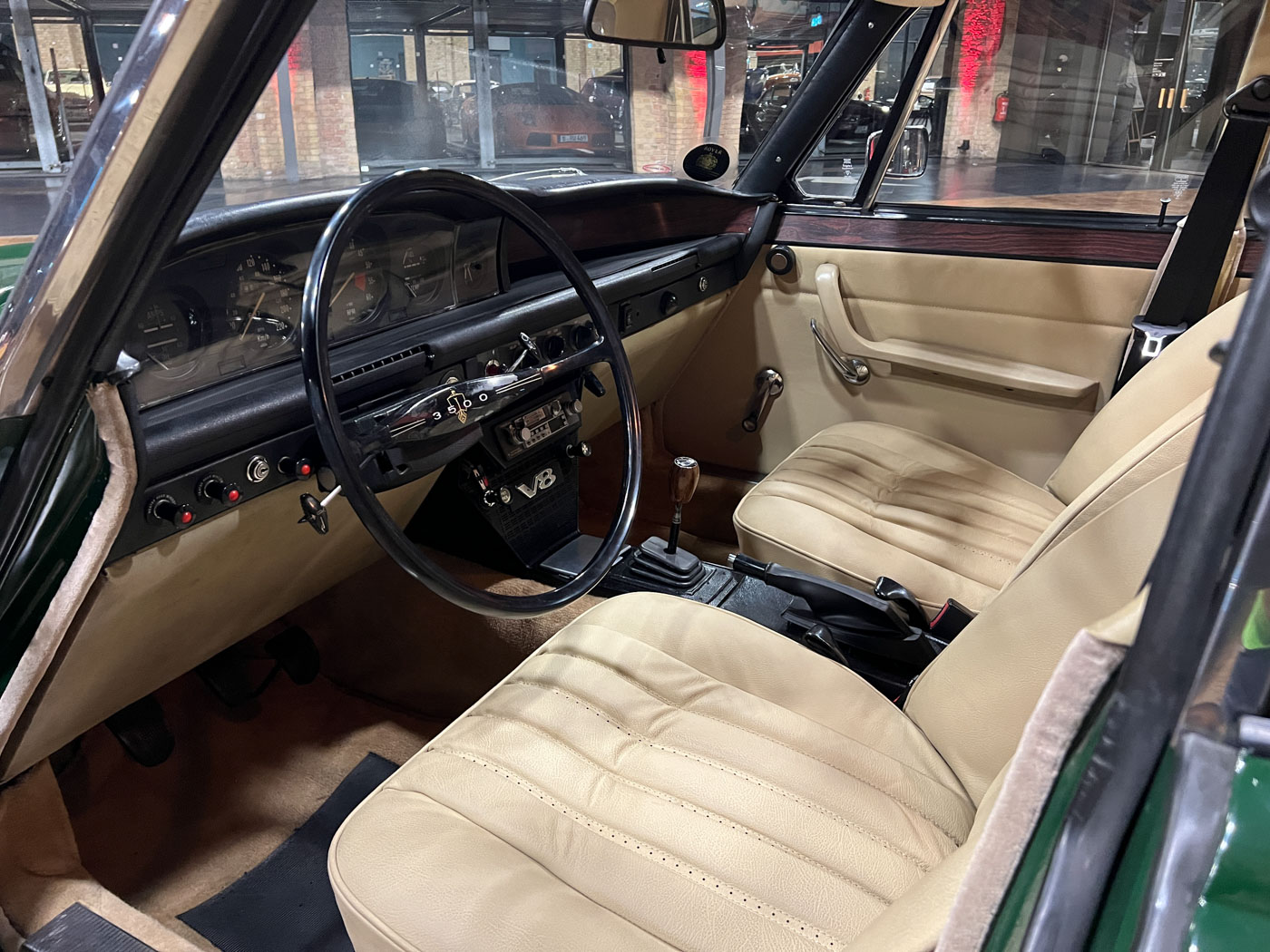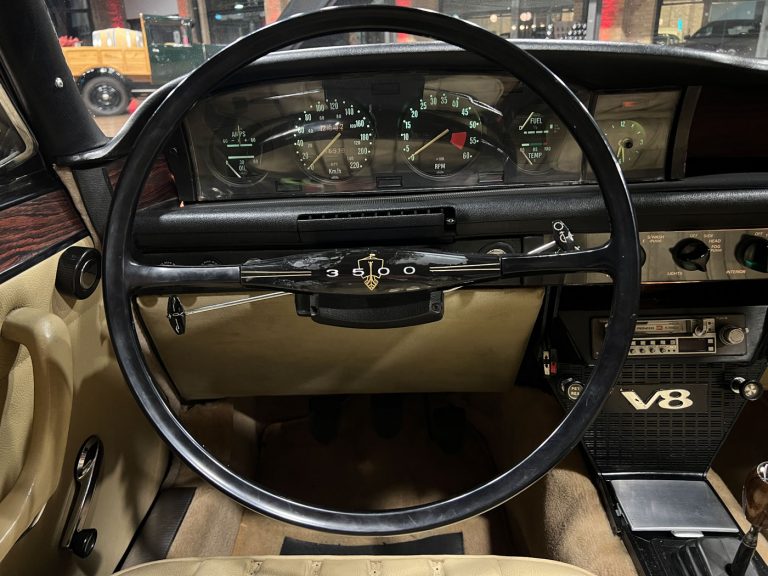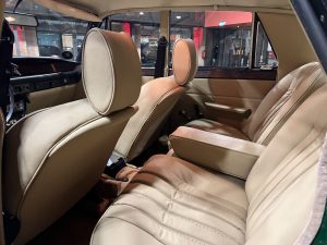 This Rover 3500 S, with a 5-speed manual transmission, electric sunroof, and diamond-cut aluminum wheels, was delivered in Italy in 1974. Unfortunately, we currently have no information about its time in Italy. In July 2021, this vehicle was featured in the Italian classic car magazine “Manovella,” and in December 2021, it also received an editorial mention in the German classic car magazine “Oldtimermarkt.” Shortly before this, the car had been imported to Germany by a classic car dealer. This dealer sold the car to someone from North Rhine-Westphalia, who had it mechanically overhauled and the leather interior reupholstered. In 2025, this gentleman from North Rhine-Westphalia received a Citroën DS Break, which we had completely restored over the course of three years. The Rover was intended as a temporary vehicle for him until his dream DS was finished, and therefore we were given the Rover to sell. In the meantime, we had removed the carburetor system, sent it off for overhaul, and reinstalled it. With its British Racing Green paint, light beige leather interior, and high-gloss rims, the car exudes a certain “Britishness,” or rather, a classic British flair.