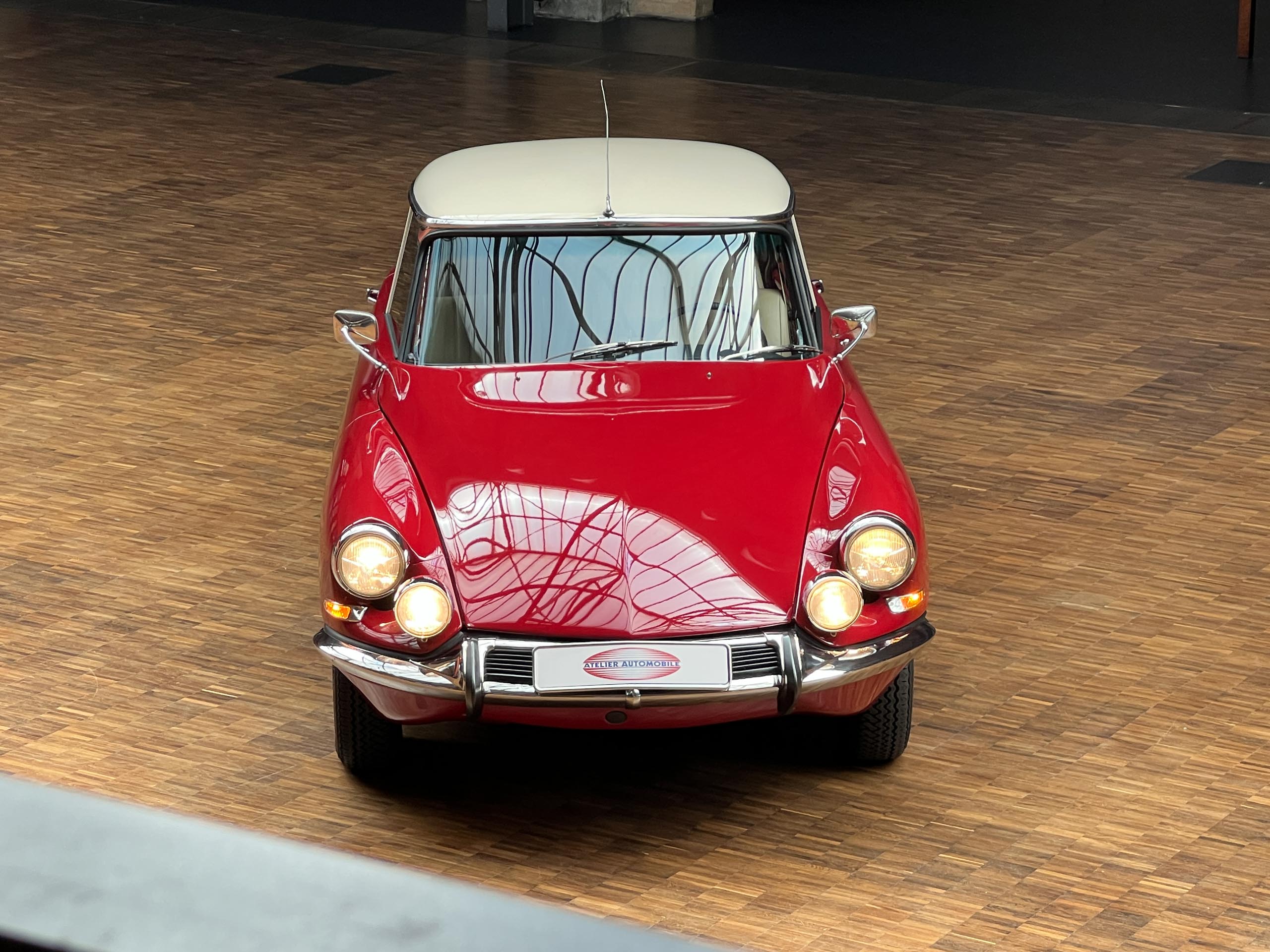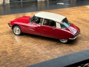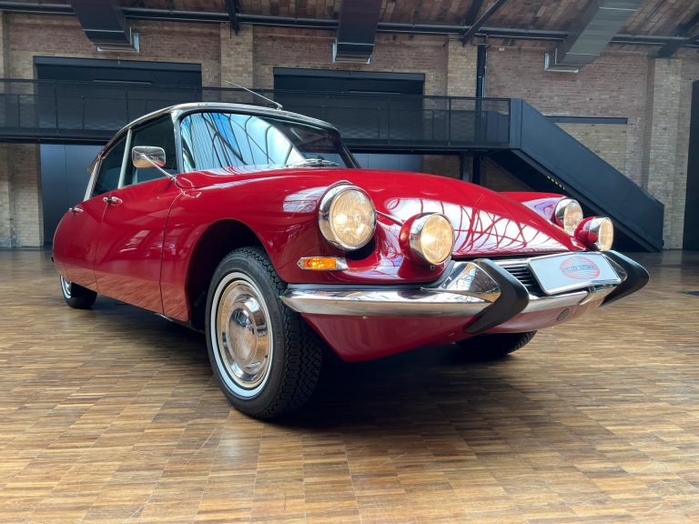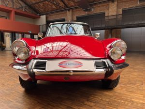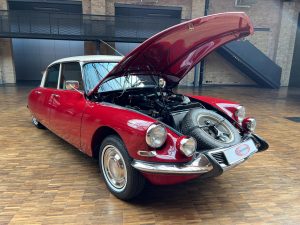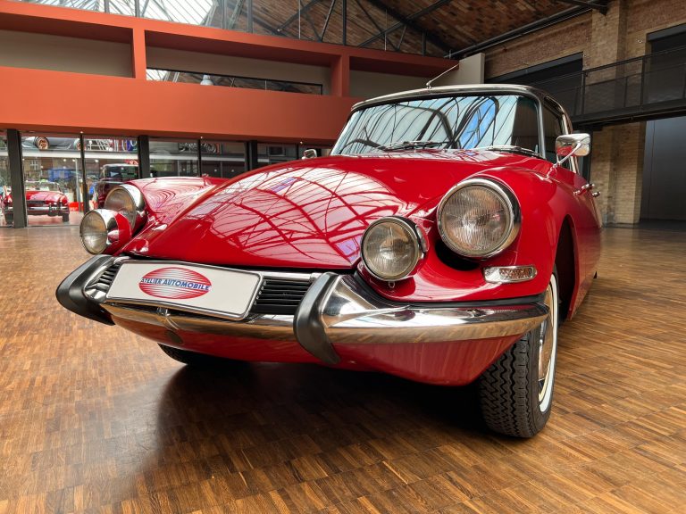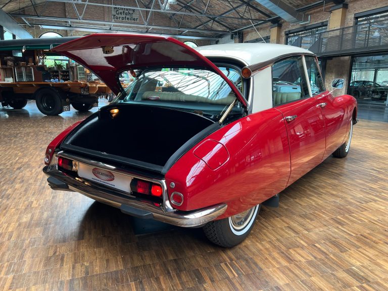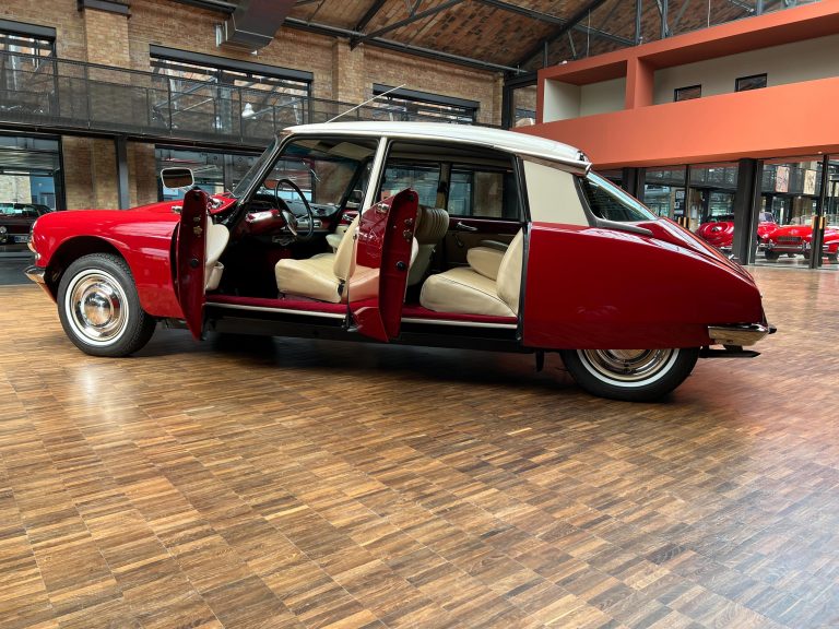 This vehicle was restored from the ground up for a customer in 2015 and rebuilt according to his wishes. His dream car was an ID with a front end from 1967, a dashboard from a DS from 1967, the exterior color Rouge Massena AC 423, a roof color Blanc Albâtre AC 096, and cream-colored leather. Furthermore, the B and C pillar trims, which are usually made of grooved aluminum or brushed stainless steel, were to be used on a government vehicle. These cars had smooth trims painted in the body color. This is how everything was done, and the dashboard, like a DS Cabriolet, was painted in the body color. The leather seats from a DS Pallas were installed and dyed cream white. The carpet was chosen in a matching red, and the front seat belts were light beige. Green tinted glass with an additional green wedge in the upper section of the windshield was also installed. Great attention to detail was paid to the restoration, and we think the photos speak for themselves. Incidentally, the 78 hp ID 19 engine was replaced with a 100 hp DS 21 engine, and a 5-speed transmission was installed. While the car doesn’t quite match its delivery specifications, you have the opportunity to own a meticulously restored vehicle at a relatively affordable price. A goddess in red and cream white – rouge et créme.