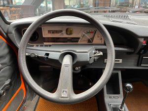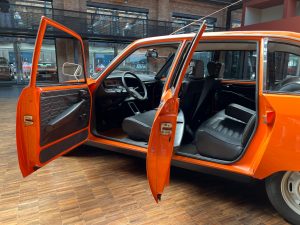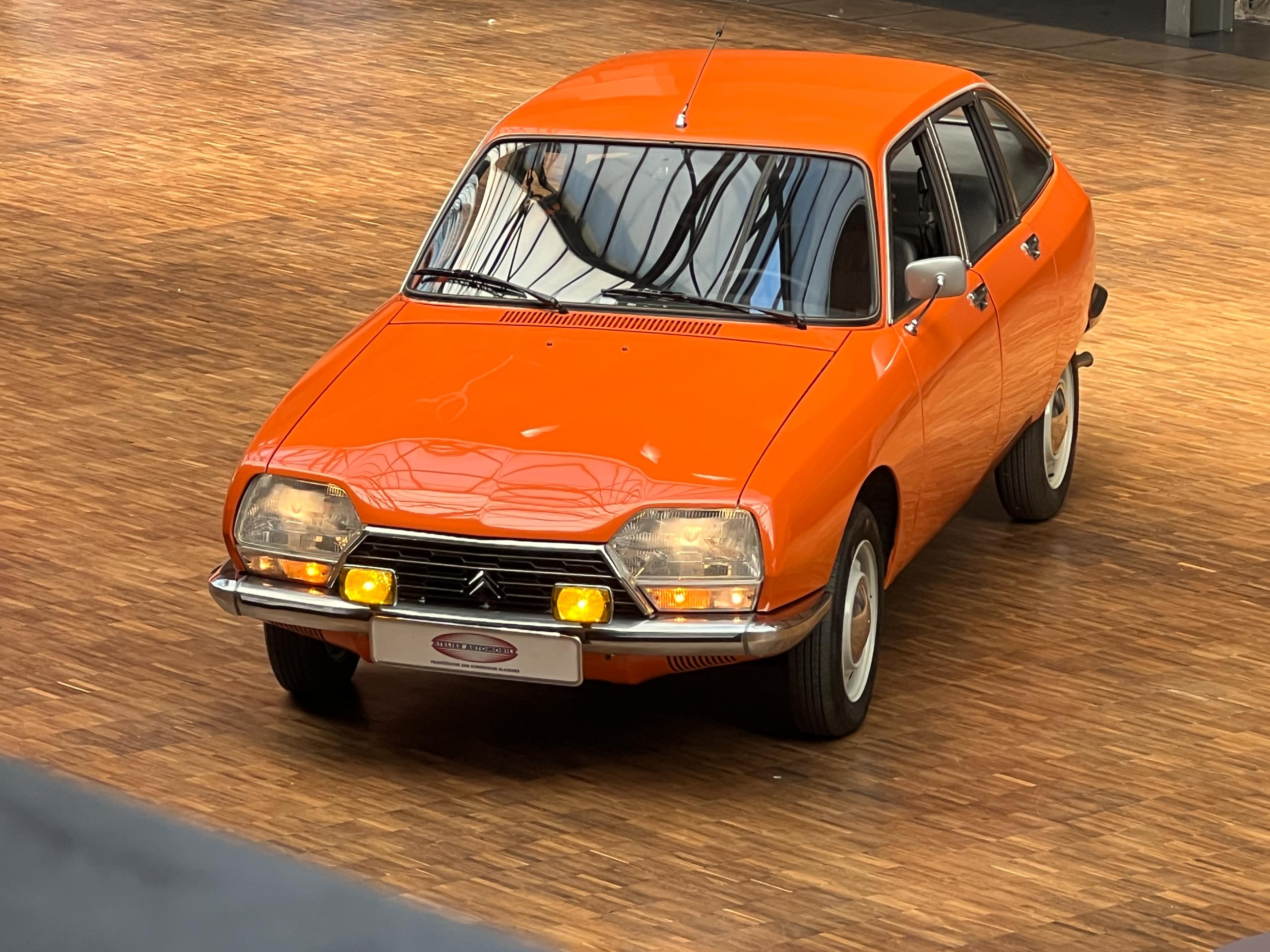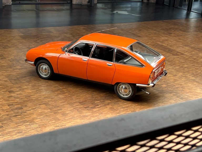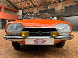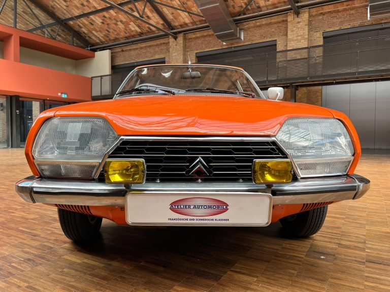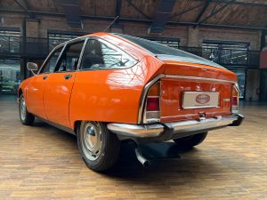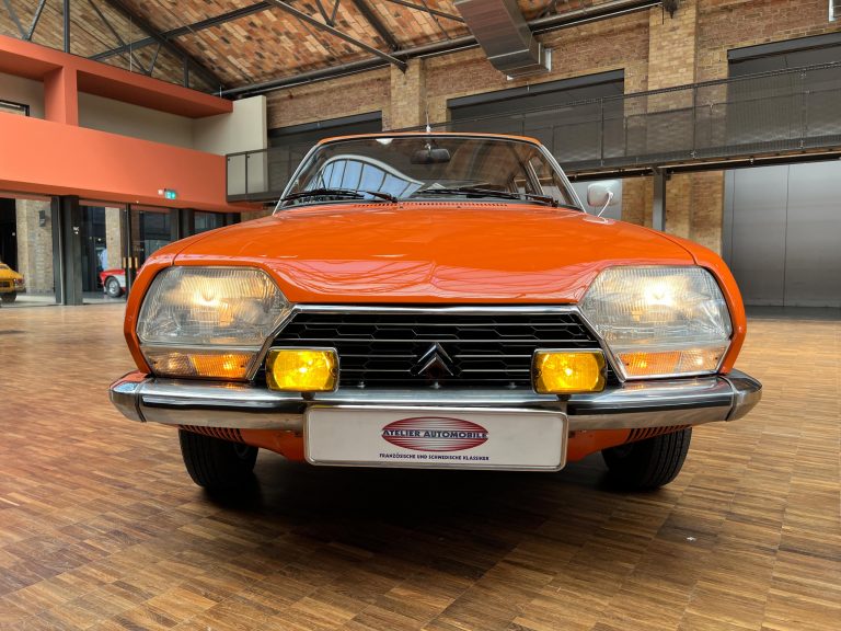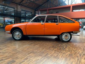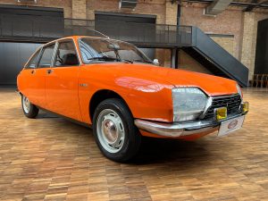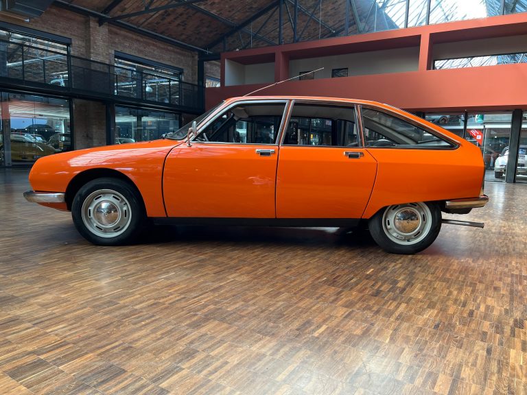 Dieser GS Club mit manuellem Vierganggetriebe wurde am 06.07.1976 in Frankreich erstmals zugelassenen. 2014 wurde das Auto von einem Sammler aus NRW nach Deutschland geholt, es gibt sogar ein Foto dieser Überführungsfahrt. Nachdem er das Auto 2016 angemeldet hatte, passierte es, dass sich spielende Kinder auf das Dach des Autos setzten und es dadurch verbeulten. Die Reparatur war dem Besitzer zu aufwändig und so kam das Auto mit dem eingebeulten Dach zu uns. Wir hatten den Wagen dann technisch überholt und äußerlich, wegen der Beulen im Dach, neu lackieren lassen und an einen guten Kunden am Niederrhein verkauft, der den Wagen gelegentlich bei schönem Wetter fuhr. 2023 brachte er den Wagen wieder zu uns und wir verkauften ihn an einen Herrn aus Baden-Württemberg. Dieser ist seitdem etwa 3.500 Kilometer mit dem Auto gefahren und genoss, wie er sagt, jeden einzelnen Kilometer. Leider muss er sich nun einer medizinischen Operation unterziehen und hat uns zuvor das Fahrzeug auf eigenen Achsen rund 600 Kilometer nach Berlin überführt, um es erneut zu vermarkten. Ohne jegliche Probleme absolvierte der GS diese Fahrt bei hochsommerlichen Temperaturen und er bedauert es sehr, das Auto wieder bei uns zu hinterlassen. Bis auf den äußerlich neuen Lack ist das Auto immer noch im Originalzustand. Der Unterboden ist völlig unberührt und bedarf keinerlei Arbeiten. Als der Wagen gebaut wurde, hatte Abba gerade mit Ihrem Song „Fernando“ einen Riesenerfolg und da dieser orange Citroën so perfekt das Flair der 1970er-Jahre verströmt, nennen wir ihn Fernando. Wenn zukünftig im Autoradio dieser Titel gespielt wird, werden Sie gegebenenfalls immer an uns denken …