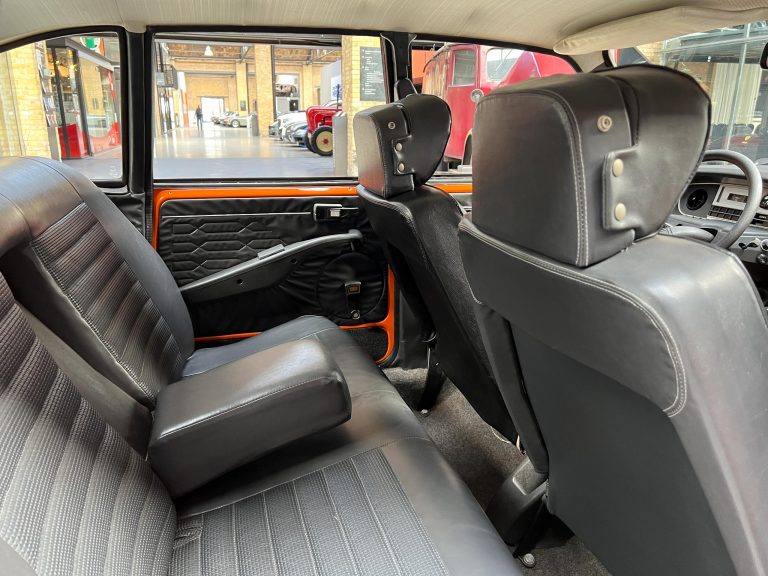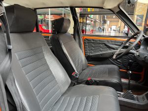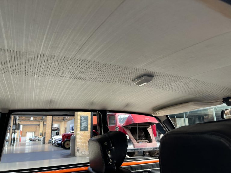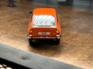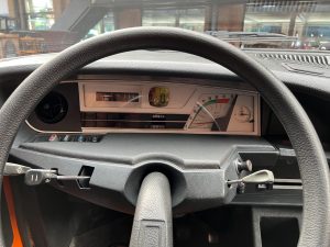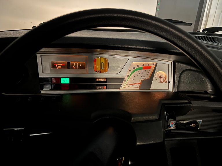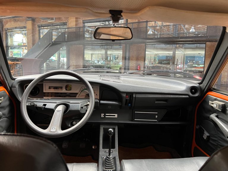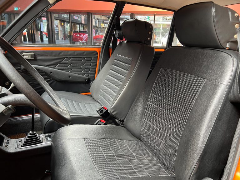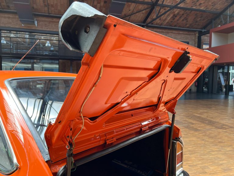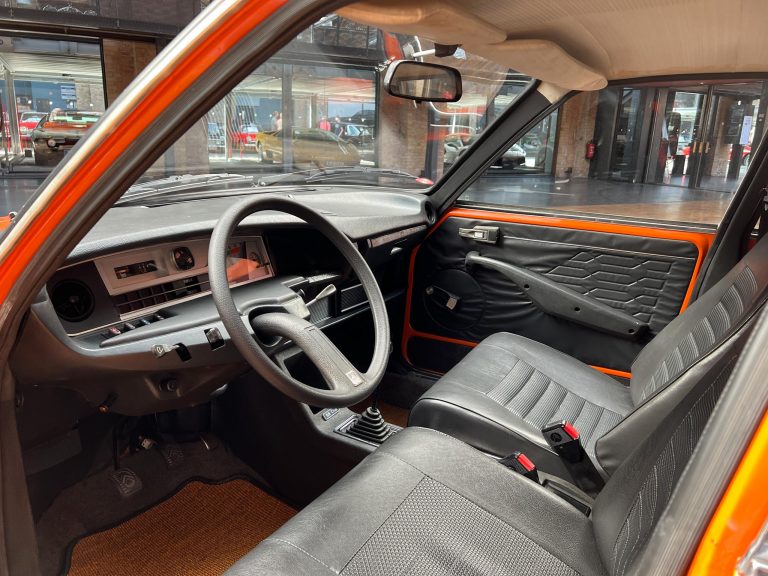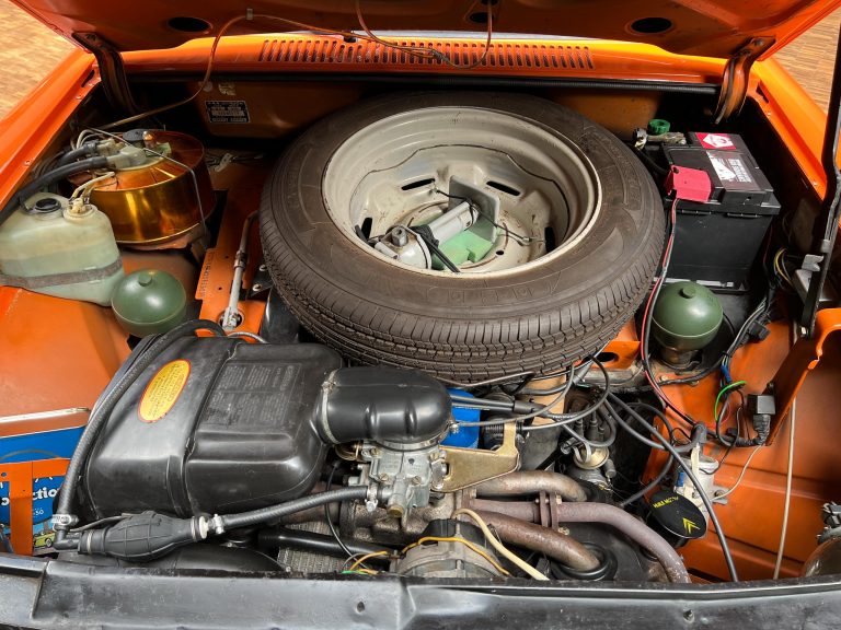 Dieser GS Club mit manuellem Vierganggetriebe wurde am 06.07.1976 in Frankreich erstmals zugelassenen. 2014 wurde das Auto von einem Sammler aus NRW nach Deutschland geholt, es gibt sogar ein Foto dieser Überführungsfahrt. Nachdem er das Auto 2016 angemeldet hatte, passierte es, dass sich spielende Kinder auf das Dach des Autos setzten und es dadurch verbeulten. Die Reparatur war dem Besitzer zu aufwändig und so kam das Auto mit dem eingebeulten Dach zu uns. Wir hatten den Wagen dann technisch überholt und äußerlich, wegen der Beulen im Dach, neu lackieren lassen und an einen guten Kunden am Niederrhein verkauft, der den Wagen gelegentlich bei schönem Wetter fuhr. 2023 brachte er den Wagen wieder zu uns und wir verkauften ihn an einen Herrn aus Baden-Württemberg. Dieser ist seitdem etwa 3.500 Kilometer mit dem Auto gefahren und genoss, wie er sagt, jeden einzelnen Kilometer. Leider muss er sich nun einer medizinischen Operation unterziehen und hat uns zuvor das Fahrzeug auf eigenen Achsen rund 600 Kilometer nach Berlin überführt, um es erneut zu vermarkten. Ohne jegliche Probleme absolvierte der GS diese Fahrt bei hochsommerlichen Temperaturen und er bedauert es sehr, das Auto wieder bei uns zu hinterlassen. Bis auf den äußerlich neuen Lack ist das Auto immer noch im Originalzustand. Der Unterboden ist völlig unberührt und bedarf keinerlei Arbeiten. Als der Wagen gebaut wurde, hatte Abba gerade mit Ihrem Song „Fernando“ einen Riesenerfolg und da dieser orange Citroën so perfekt das Flair der 1970er-Jahre verströmt, nennen wir ihn Fernando. Wenn zukünftig im Autoradio dieser Titel gespielt wird, werden Sie gegebenenfalls immer an uns denken …
