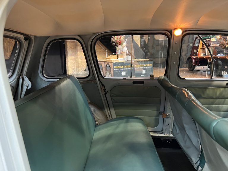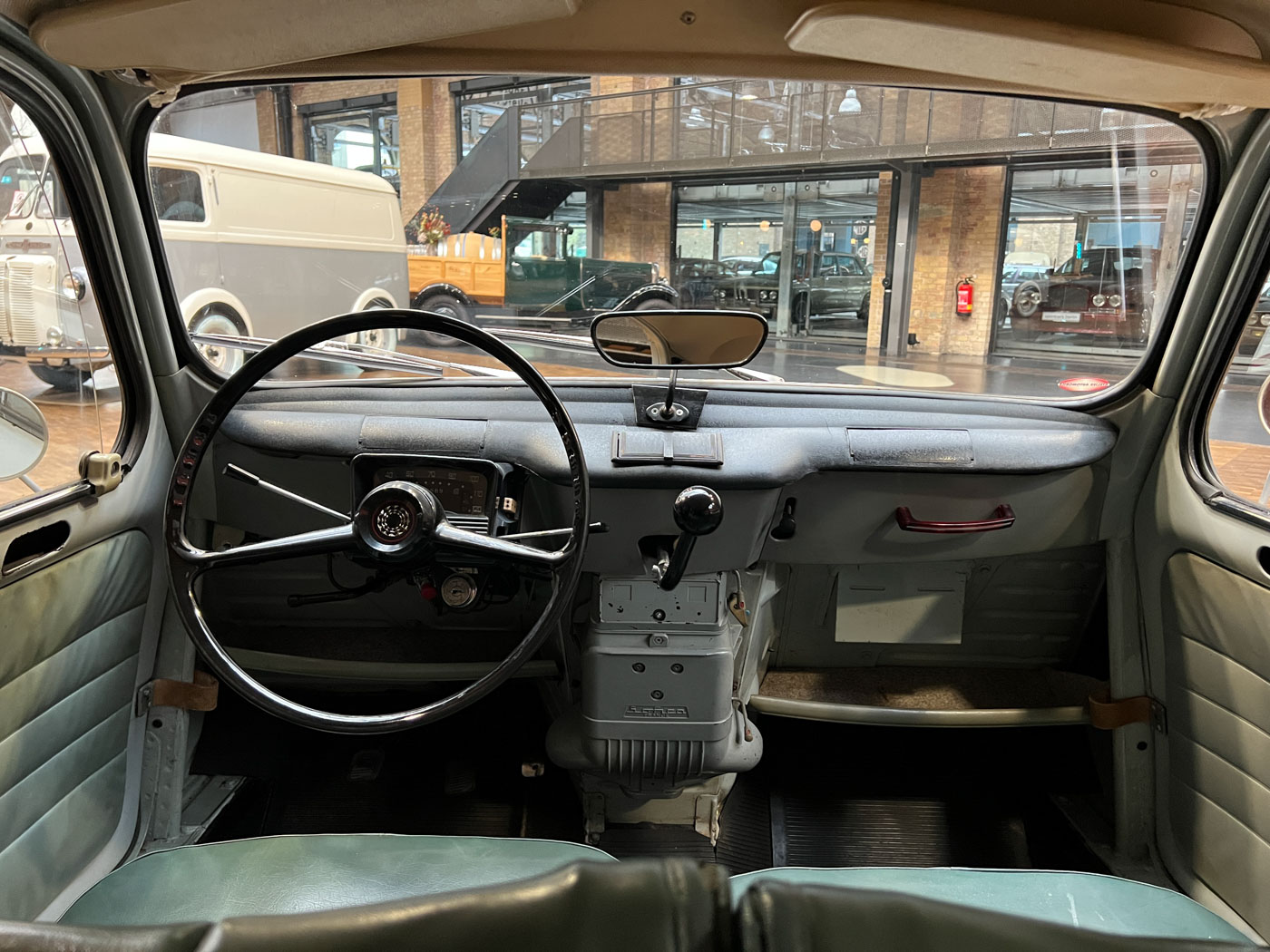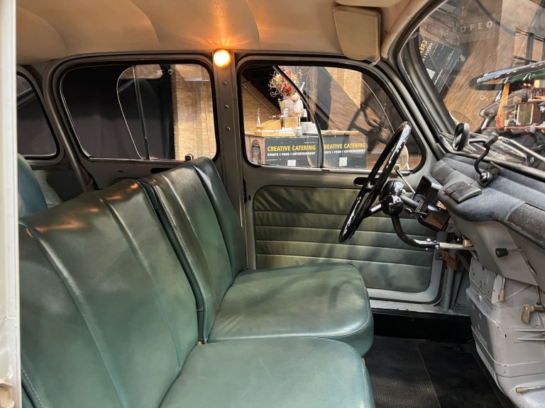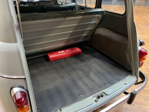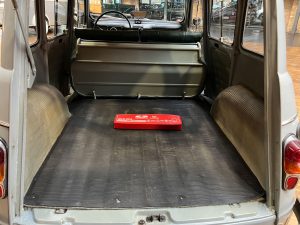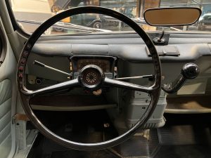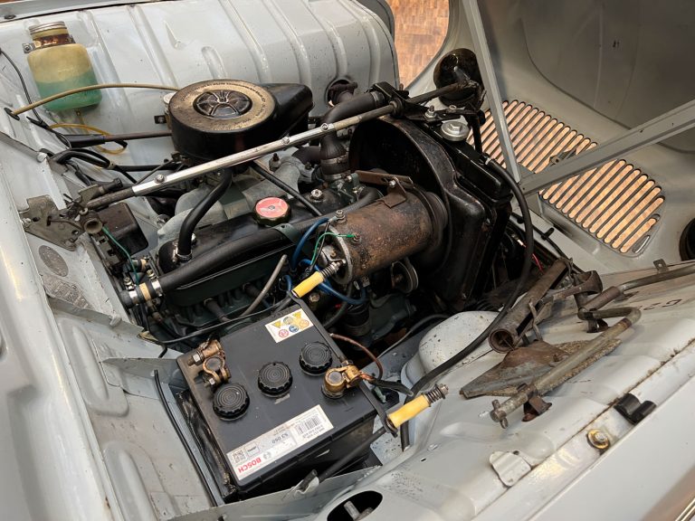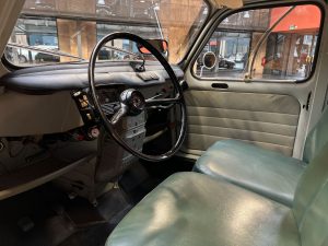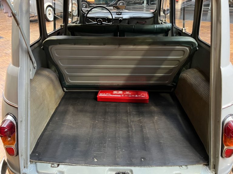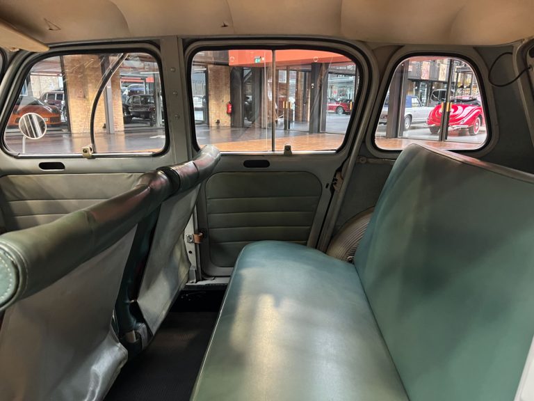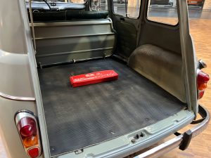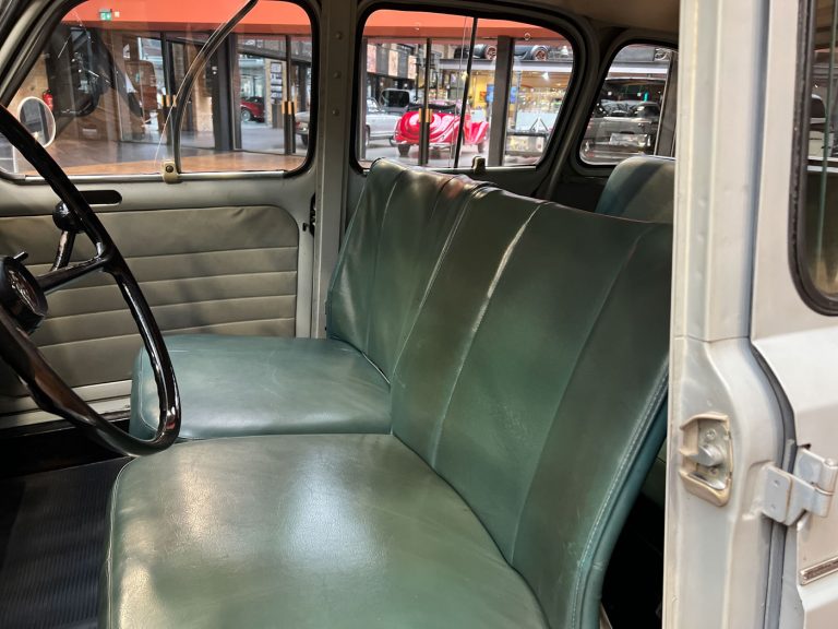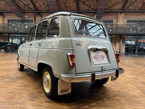 Diesen R4 L wurde am 29.07.1964 in Südfrankreich erstmals zugelassen. In den 1990er Jahren wurde der bis dahin vollkommen original erhaltene Renault nach München verkauft und kurz danach an jemand aus Bremen. Der Besitzer in Bremen hatte den immer noch gänzlich original erhaltenen Wagen äußerlich neu lackieren lassen. Diese Lackierung wurde nicht ganz fachgerecht ausgeführt, aber genau das passt, wie wir finden, absolut perfekt zu dem Auto. Das Auto strahlt eine sehr sympathische Authentizität aus, wozu der nicht in Hochglanz glänzende Lack eindeutig den Charakter des Fahrzeugs unterstützt. Die Innenausstattung ist noch absolut original erhalten. Der Dachhimmel hat zwei kleine Schadstellen, die man partiell ausbessern kann, und die originalen grünen Kunstleder-Sitzbezüge kontrastieren sehr harmonisch mit dem hellblauen Lack. Eine frühe Renault 4 L in authentischem Zustand – La Quatrelle Authentique.