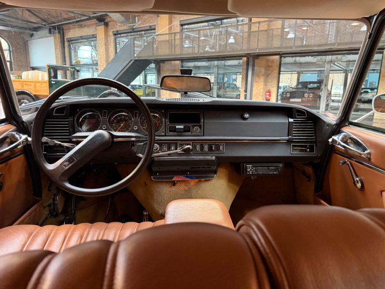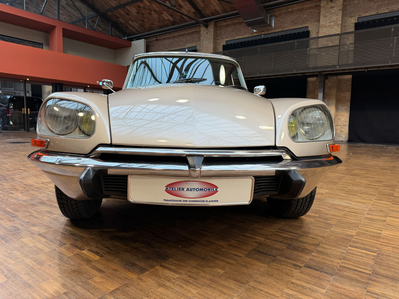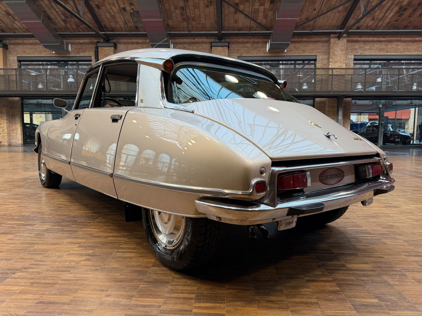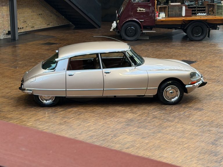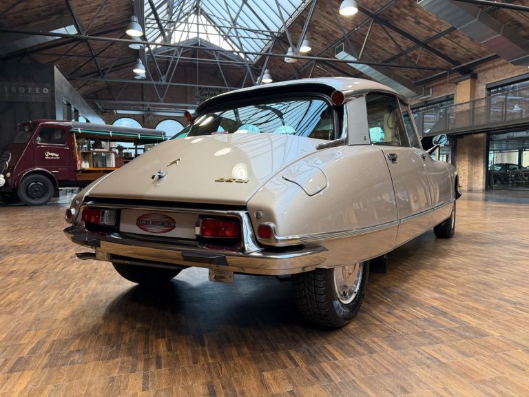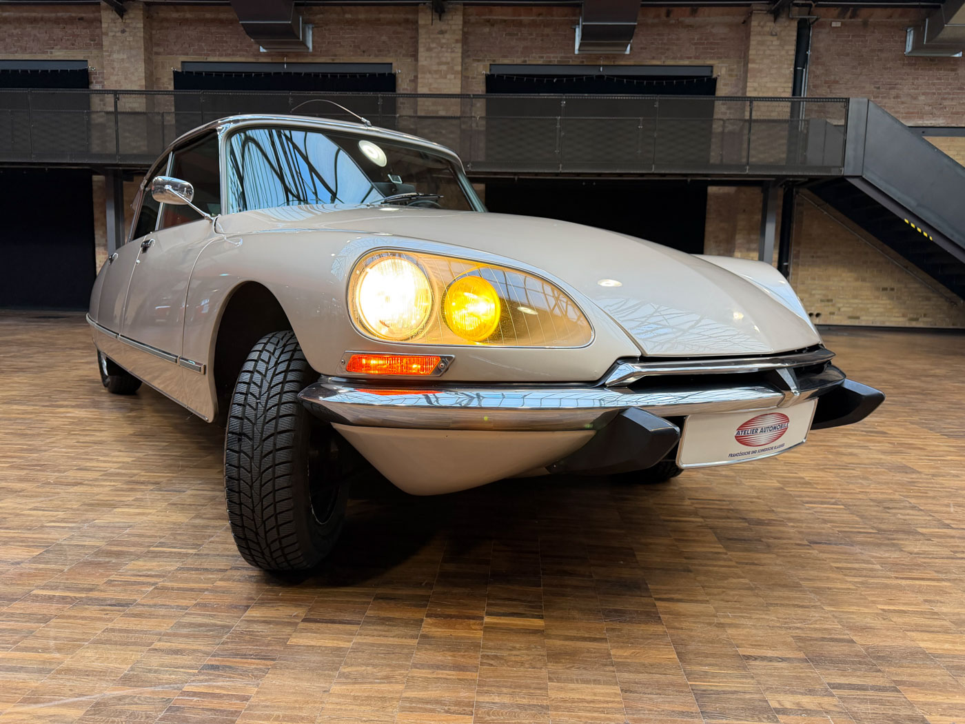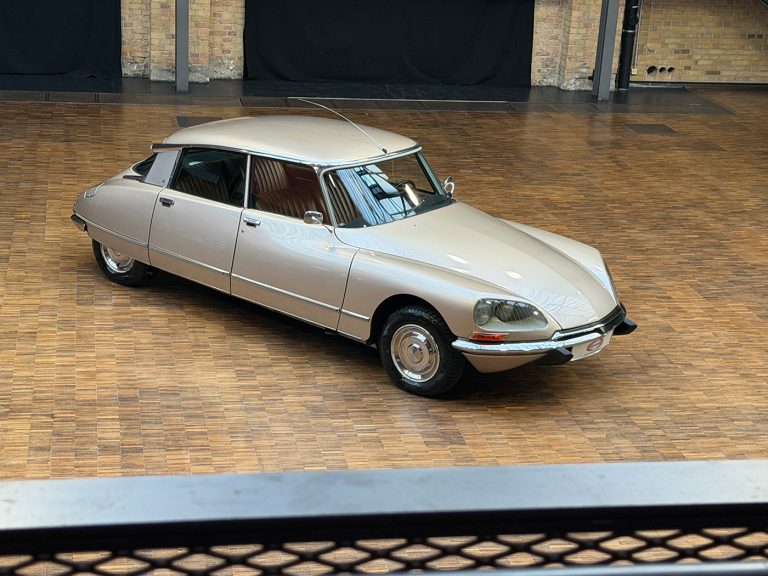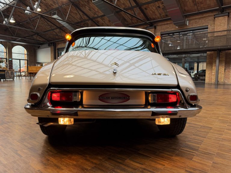 Als die Déesse (französisch für Göttin) auf dem Pariser Autosalon 1955 vorgestellt wurde, titelte l’auto-journal mit der Schlagzeile „Die Bombe ist geplatzt!“. Und was für eine Bombe, denn zum Ende des Salons konnte man über 80.000 unterschriebene Kaufverträge vorweisen! In knapp zwanzig Jahren Bauzeit konnten 1.455.746 Exemplare dieses Modells verkauft werden. Mit ihrem ungewöhnlichen Design, ihrer hydropneumatischen Federung, der Hochdruckbremse, der Servolenkung, dem halbautomatischen Getriebe, dem im Motorraum platzierten Reserverad und vielen anderen Details, war die DS wahrscheinlich die große Sensation im Automobilbau überhaupt. Zum ’66er-Modelljahr kam zur „normalen“ DS die DS Pallas (Pallas ist die altgriechische Göttin der Weisheit) hinzu. Technisch vollkommen gleich, zeichnete sich die Pallas durch eine feudalere Innenausstattung mit dickeren Sitzen und Teppichen und äußerlich durch erheblich mehr Chromzierrat aus. Zum Modelljahr 1967 erhielten alle Modelle eine anders gestaltete Front mit Doppelscheinwerfern hinter einem Glas, von denen ein Paar über Seilzüge mit der Lenkung verbunden ist – das berühmte Kurvenlicht der DS war geboren! Eine DS Pallas war Ende der 60er Jahre das komfortabelste Auto überhaupt und wurde von Mercedes und Jaguar als Maßstab anerkannt. Bis heute kennen wir kein Auto, welches die Unebenheiten des Straßenbelags besser „wegbügelt“ als eine DS. Die millionste DS, die 1970 von einem Studenten bei einem Radiogewinnspiel gewonnen wurde, wurde in sable métallisé (sandmetallic) lackiert, genau wie das Fahrzeug, um das es hier geht.