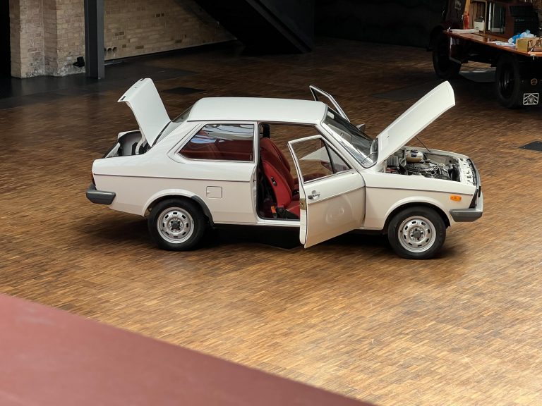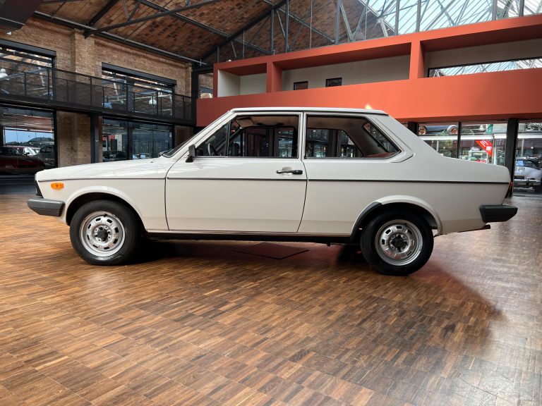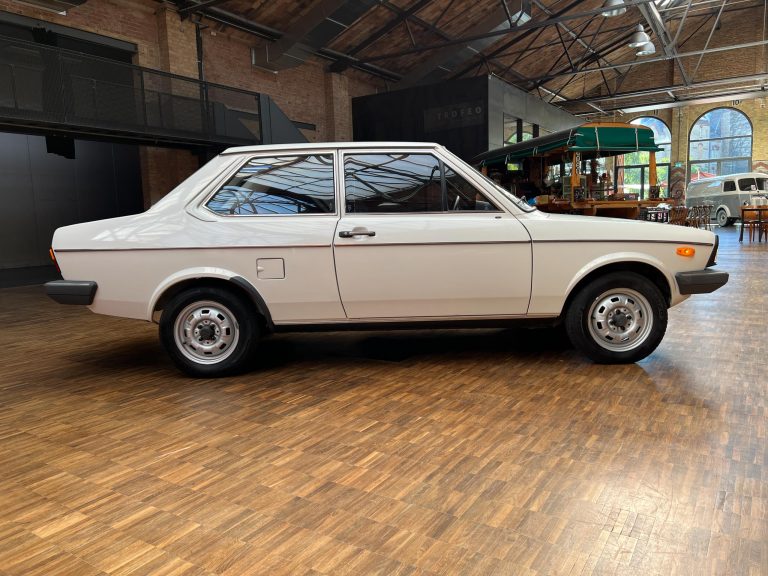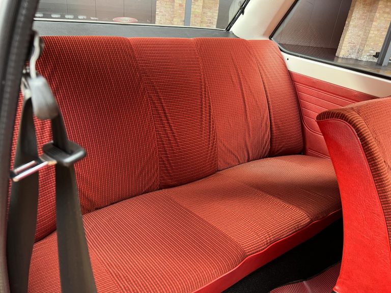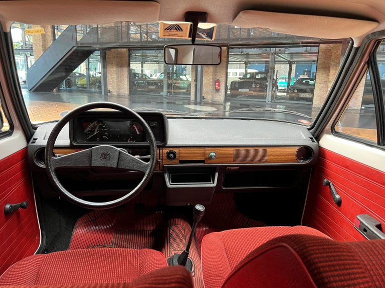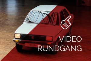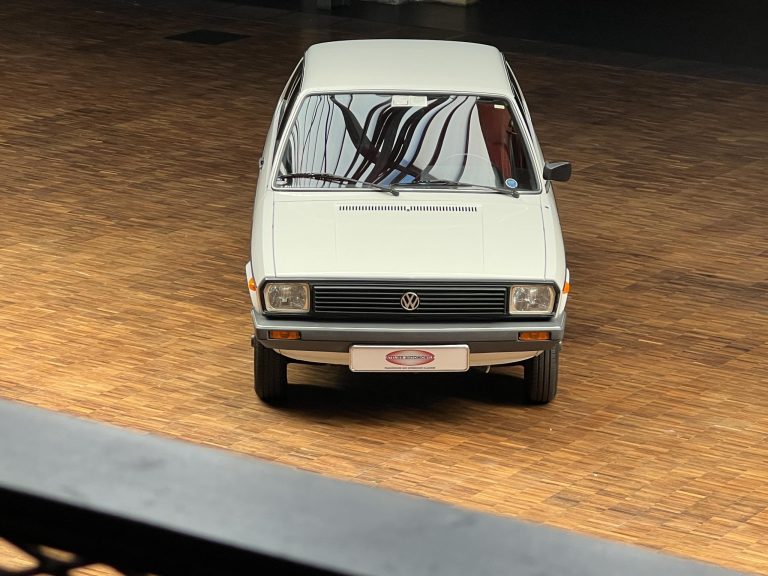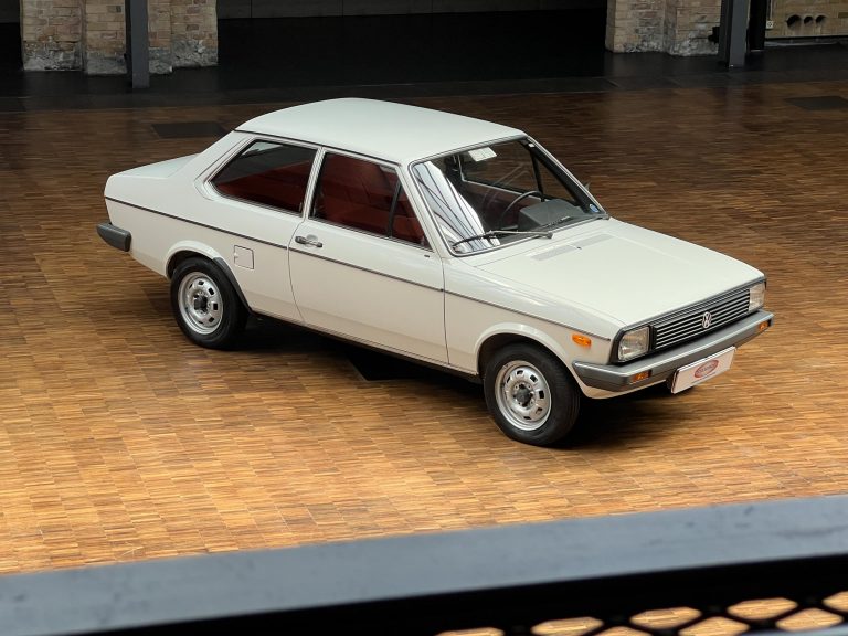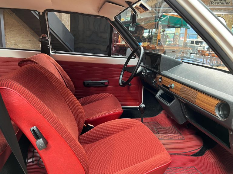Dieser VW Derby ist durch zwei Presseberichte im Jahr 2021 in der Autobild und der Autobild-Klassik bekannt. Zu diesem Zeitpunkt hatte das Auto erst sensationelle 845 Kilometer Laufleistung hinter sich! Der kleine VW wurde am 16.04.1981 auf einen Herrn in Südtirol in Italien, nennen wir ihn Giuseppe, zugelassen. Giuseppe hatte wohl vor, den Derby gut zu pflegen und lange zu erhalten, denn er ließ ihn vor der Auslieferung gründlich hohlraumkonservieren und überzog die vorderen Sitze mit Schonbezügen. Kurz nachdem er den weißen Wolfsburger mit rotem Interieur erhalten hatte, verstarb Giuseppe offenbar unerwartet. Seine Witwe brachte es nicht über’s Herz, den Derby zu nutzen oder gar zu verkaufen. Ihr Fiat 850 funktionierte immer noch stets zuverlässig und so schlummerte der neue Derby in der Garage vor sich hin. „Schneewittchen“ schlief bis 2019, als ein Oldtimersammler aus Südtirol die kleine Limousine fand und „wachküsste“. Er ließ alle Flüssigkeiten erneuern, die Bremsen überholen, gönnte dem Motor eine behutsame Wiederbelebung, ließ neue Reifen aufziehen und vor allem den Zahnriemen des Motors erneuern. Am 16.09.2021 wurde der VW dann auf seinen zweiten Besitzer angemeldet und dieser meldete sich bei der Autobild, die die beiden Berichte lancierte. Seitdem ist der Wagen bekannt, und als sich 2025 der Besitzer an unseren Geschäftsführer Herrn Kayser wandte, war auch ihm das Auto aus der Presse bekannt. Der zweite Besitzer hat die Laufleistung auf jetzt 1.560 Kilometer fast verdoppelt, ihm ist das Auto aber zu schade, um es in seiner Sammlung weiter schlummern zu lassen. Also hat er sich an uns gewendet und uns den sagenhaften Derby per Spedition anliefern lassen, um ihn in Liebhaberhände abzugeben.