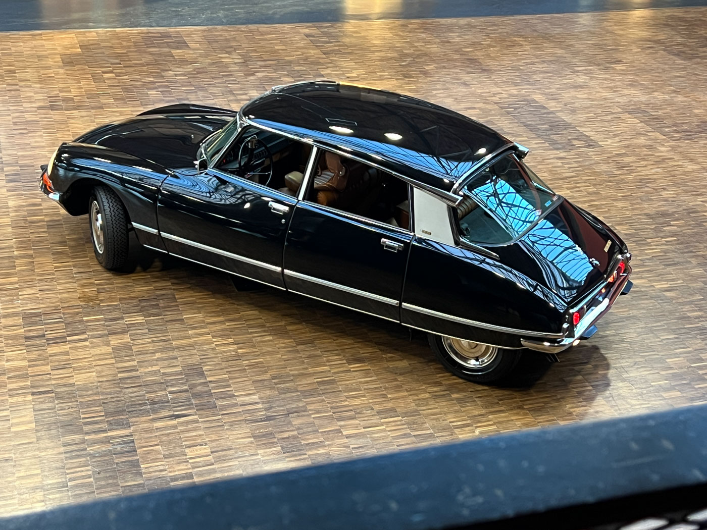 Lors de la présentation de la DS (qui signifie « Déesse » en français) au Salon de l’automobile de Paris en 1955, le magazine L’Auto titrait : « La bombe a explosé ! » Et quelle bombe ! À la fin du salon, plus de 80 000 contrats de vente avaient été signés. En moins de vingt ans de production, 1 455 746 exemplaires de ce modèle furent vendus. Avec son design atypique, sa suspension hydropneumatique, ses freins haute pression, sa direction assistée, sa boîte de vitesses semi-automatique, sa roue de secours fixée au moteur et bien d’autres atouts, la DS fut sans doute la plus grande sensation de l’histoire de l’automobile. Pour l’année-modèle 1966, la DS Pallas vint compléter la gamme DS. Techniquement identique, la Pallas se distinguait par un intérieur plus luxueux, avec des sièges et des moquettes plus épais, et par des chromes extérieurs nettement plus présents. Pour l’année-modèle 1967, tous les modèles bénéficièrent d’une face avant redessinée avec des phares doubles intégrés à un seul bloc optique, dont une paire était reliée à la direction par des câbles : les fameux feux de virage DS étaient nés ! À la fin des années 1960, la DS Pallas était la voiture la plus confortable du marché et faisait figure de référence pour Mercedes et Jaguar. Aujourd’hui encore, aucune autre voiture n’absorbe aussi bien les irrégularités de la route qu’une DS.